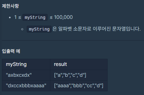 문자열 myString이 주어진다. "x"를 기준으로 해당 문자열을 잘라내 배열을 만든 후, 사전순으로 정렬한 배열을 리턴하는 함수를 완성하라