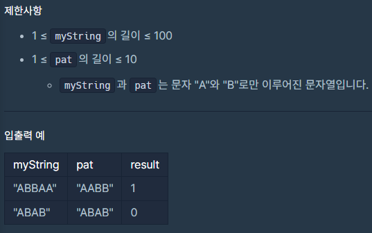 문자 "A", "B"로 이뤄진 문자열 myString, pat이 주어진다. myString의 "A"를 "B"로, "B"를 "A"로 바꾼 문자열의 연속하는 부분 문자열 중 pat이 있으면 1, 아니면 0을 리턴하는 함수를 완성하라