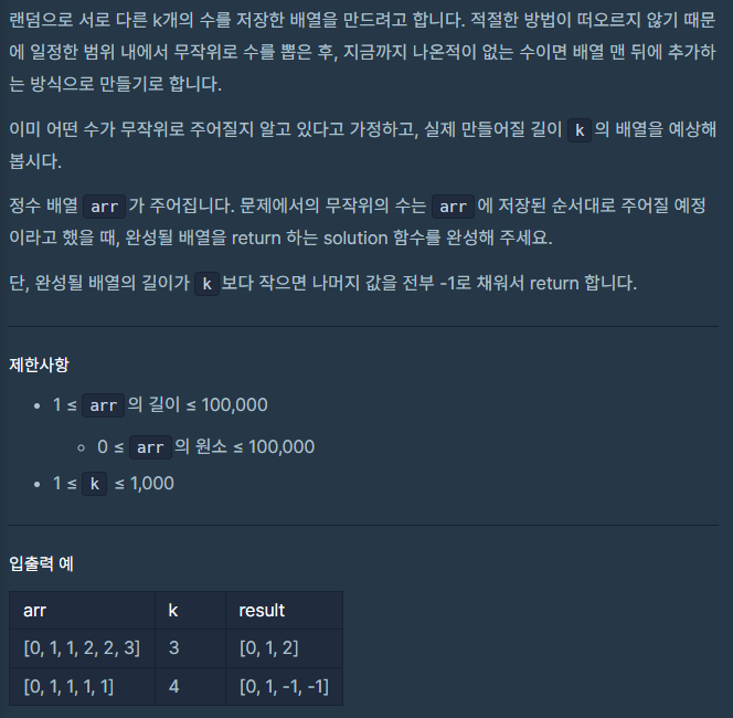 [Algorithm] 프로그래머스 - 무작위로 K개의 수 뽑기 (Kotlin) 본문