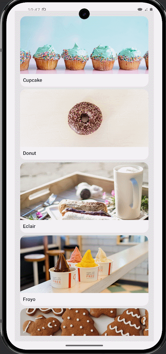 공유 요소는 AnimatedVisibility에서도 작동한다. 아래 예시에서 각 요소는 AnimatedVisibility로 래핑되며 아이템을 클릭하면 컨텐츠가 UI에서 다이얼로그 같이 끌어당겨지는 시각적 효과를 낸다.
