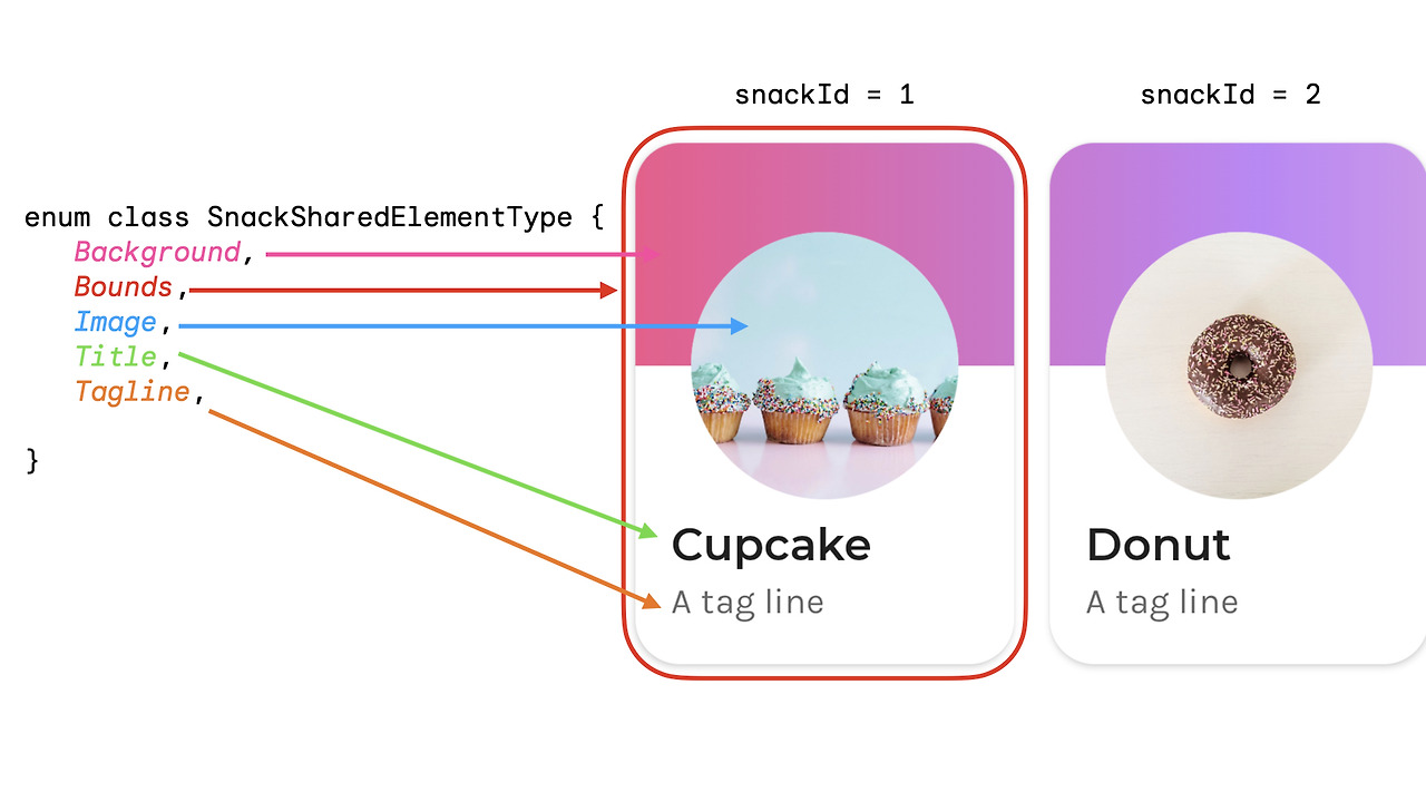 공유 요소가 복잡할 때는 문자열 일치에 오류가 발생할 수 있어서 문자열이 아닌 key를 만드는 게 좋다. 일치가 발생하려면 각 key는 고유해야 한다. Jetsnack엔 아래 같은 공유 요소가 있다.