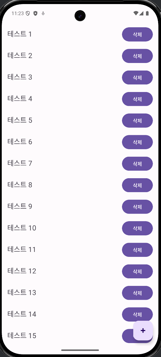 즉 3번째 아이템의 버튼을 누르면 삭제할 아이템(3번째 아이템)을 제외한 새 리스트가 만들어지고, submitList()를 통해 ListAdapter에 전달된다. 이 때 마찬가지로 변경사항을 감지한 ListAdpater는 애니메이션과 함께 3번째 아이템을 리사이클러뷰에서 제거하고 UI를 업데이트한다.