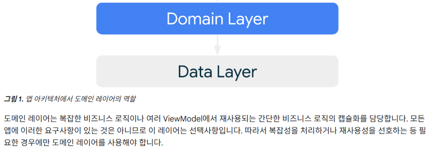 일반적인 구현 패턴은 뷰모델이 유스케이스에만 접근할 수 있도록 엄격하게 적용해서 repository에 직접 접근하는 걸 완전히 제한한다. 이 접근법은 도메인 계층 패턴의 일부지만 구글 안드로이드 팀은 이걸 선택사항으로 유지할 것을 권장한다.