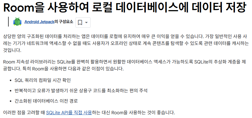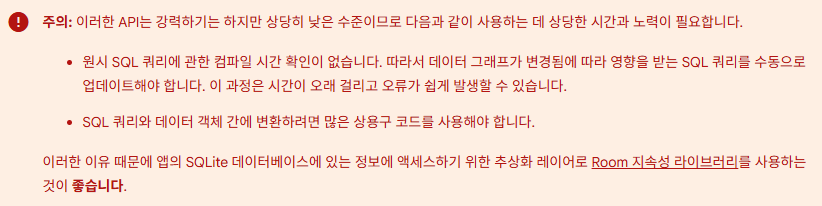 사실 대놓고 Room 쓰라고 광고하고 있다. 하단의 하이퍼링크를 클릭하면 SQLite 문서로 이동하긴 하지만 도입부에 주의 문구를 표시하고 있다.
