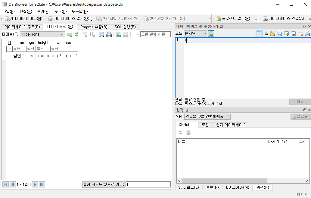 ## [sqlite] 업데이트 결과 : Person(id=1, name=김철수, age=30, height=190.0, address=ㅂㅂ시 ㅂㅂ구)