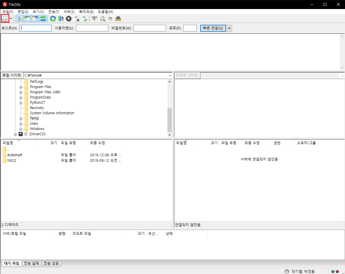 2. 파일질라를 연다. 3.46.3 버전 기준 이 화면이 나올 것이다.
