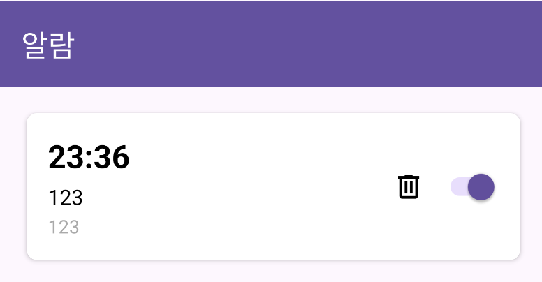 알람이 생성되면 AlarmListActivity가 아래처럼 바뀌어 보인다.