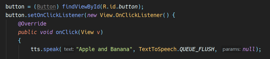 방법은 생각보다 정말 간단하다. 아래는 TTS를 버튼의 클릭 리스너에 달아서 미리 입력해 둔 문장을 읽는 예제다.