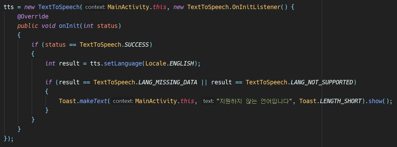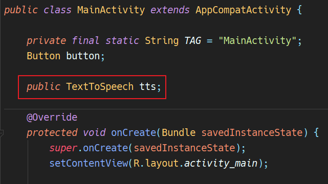 onCreate() 안에서 new TextToSpeech()를 선언해준다. 이 선언 없이 곧바로 tts.speak()를 호출한다면 NullPointException이 뜨니까 이 부분은 꼭 선언해준다.