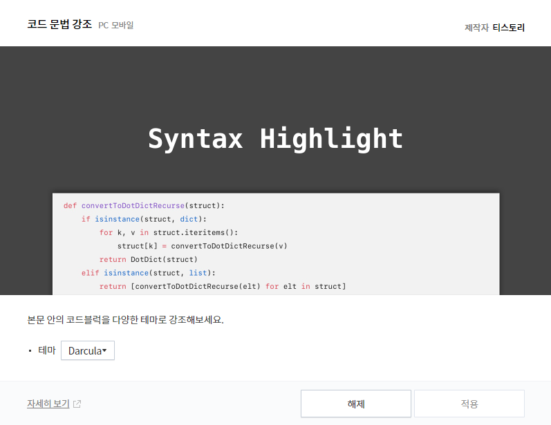 내가 썼던 글이니 글 수정하기 눌러서 원문을 복사하는 걸로 때웠지만 이것도 귀찮아서 코드 하이라이트를 어떻게 적용하는지 구글에 물어봤다.