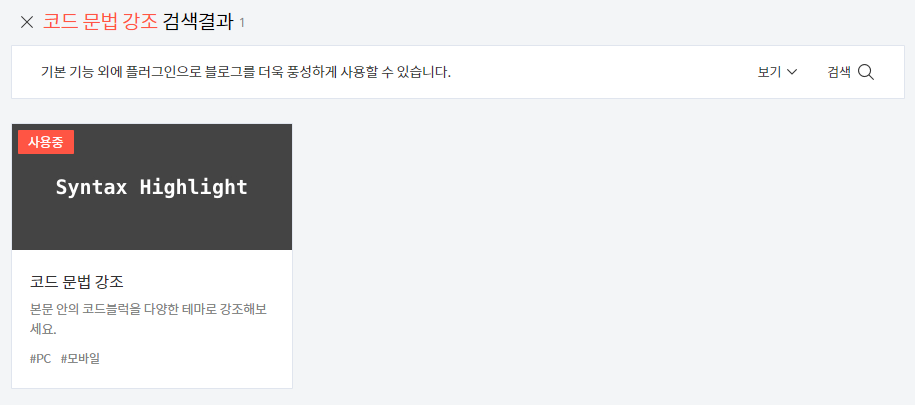 플러그인을 클릭하면 이 화면이 나온다. 여기서 검색 버튼을 누르고 "코드 문법 강조" 라고 검색한다.