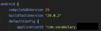 다음은 앱 수준 gradle 파일이다. 여기선 android 중괄호 안의 defaultConfig 중괄호 안에 있는 applicationId 오른쪽을 확인하면 된다.