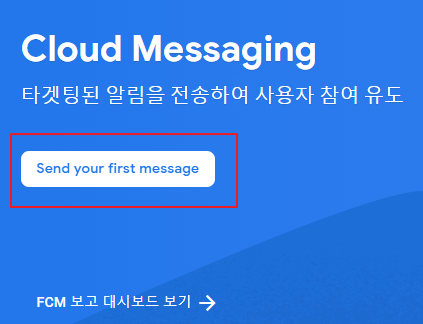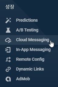 그 다음 파이어베이스 콘솔 웹 페이지로 돌아온다. 왼쪽 탭 목록에 마우스를 대고 밑으로 스크롤 좀 내리면 Cloud Messaging이란 탭이 보인다. 누른다.