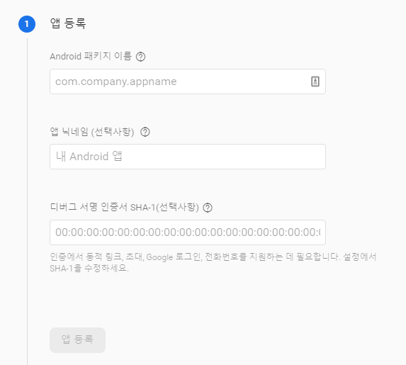 앱 닉네임은 알아서 하고, SHA-1키 구하는 법은 아래 포스팅 참조. 10초면 구한다.