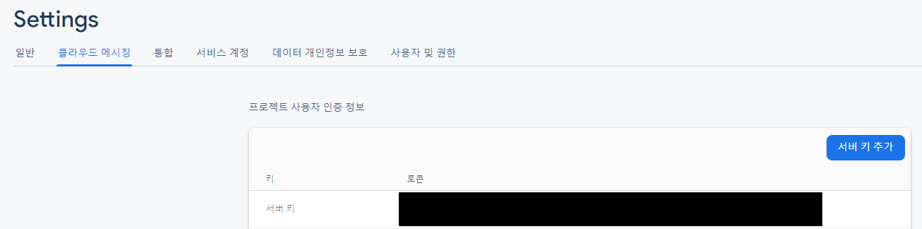 프로젝트 설정을 누르고 클라우드 메시징 탭을 누르면 서버 키가 나온다. 이 서버 키를 복사해서 위 코드의 $header 옆의 파이어베이스 서버 키라 써진 부분에 복붙하면 된다.