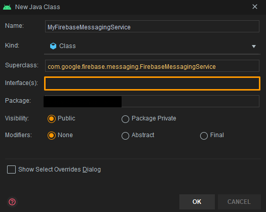 stopWithTask 옵션은 필요없으면 빼도 된다. 이렇게 매니페스트 수정이 끝났다면 저 MyFirebaseMessagingService 이름의 클래스를 만들어주자. 패키지 만들어서 안에 넣고 싶으면 매니페스트에도 똑같이 반영시켜줘야 한다.