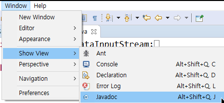 이 상태에서 자바 독스를 볼 수 있게 설정하려면, 위에서 Window -> Show View -> Javadoc을 누르면 된다.