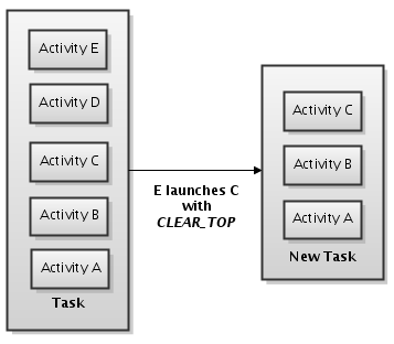 위 이미지처럼 ABCDE 액티비티가 있는 상태에서 C를 호출하게 되면 ABC만 남게 되고 D, E는 사라진다.