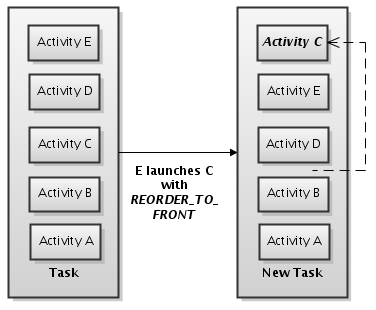 위 이미지처럼 ABCDE 순서로 액티비티 스택이 만들어져 있는 상태에서 C 액티비티를 호출하면 ABDEC 형태로 정렬된다. 자주 쓰진 않는다.
