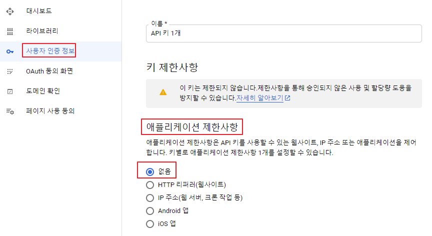 즉 Vision API 콘솔의 사용자 인증 정보에서 애플리케이션 제한사항 부분을 아래와 같이 바꿔줘야 한다.