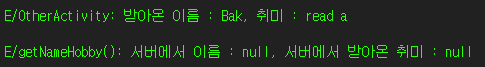 Log.e("getNameHobby()", "서버에서 이름 : " + getted_name + ", 서버에서 받아온 취미 : " + getted_hobby);