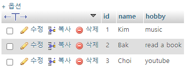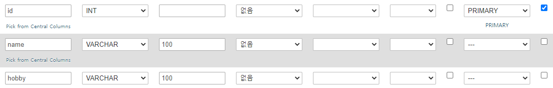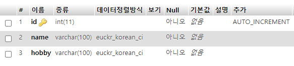 테이블 컬럼은 PK인 id, 이름을 담을 name, 취미를 담을 hobby의 3개 컬럼만 만든다.