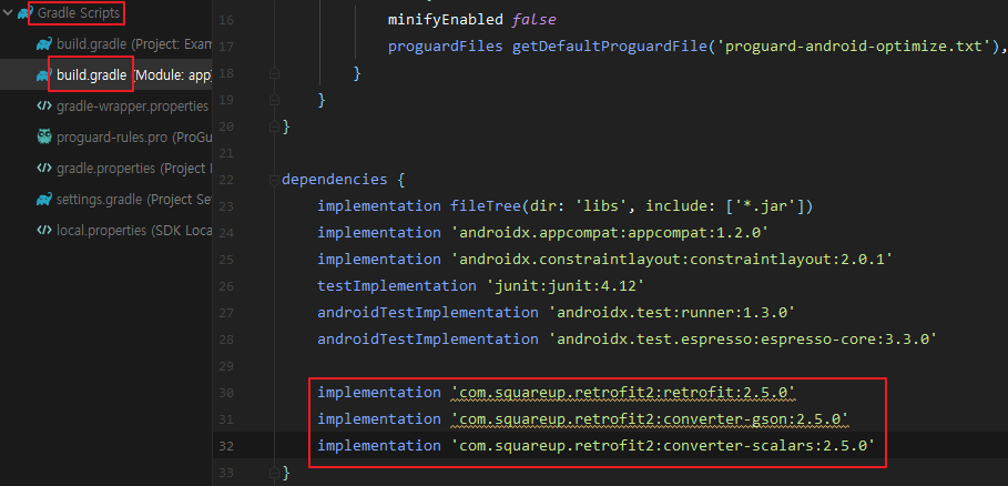 앱 수준 gradle에 의존성 주입 시 3개를 다 넣었다면 addConverter 부분에서 빨간 줄이 나진 않을 것이다.