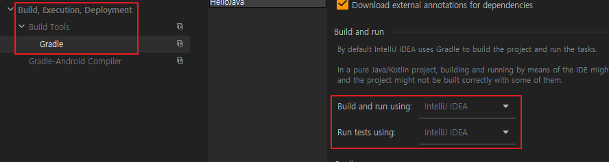 방법은 설정을 열고 gradle을 검색해서 Build Tools 아래의 Gradle 탭을 클릭 > gradle로 돼 있는 두 곳을 인텔리제이로 바꿔주면 된다.