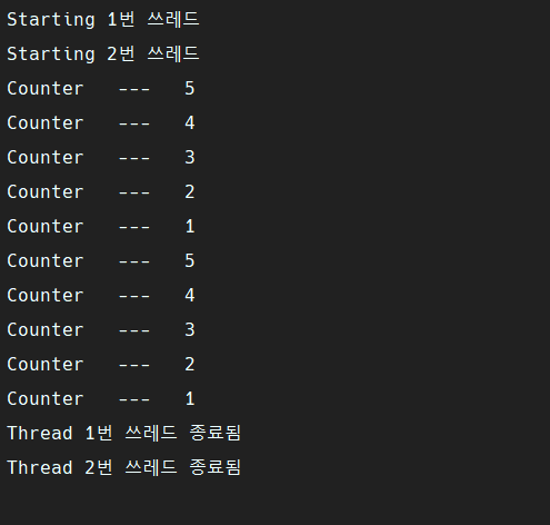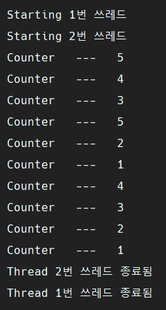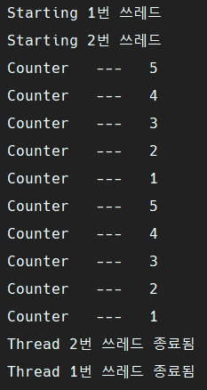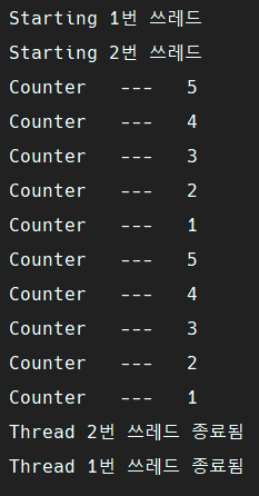 메서드가 끝나면 쓰레드가 종료됐다는 문구가 나올 것이다.