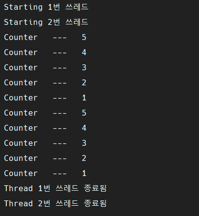 메인쓰레드에선 메서드 호출을 위해 PrintDemo 클래스의 객체를 만들고 ThreadDemo의 객체를 2개 만들어 쓰레드를 만든다. 그리고 각각 이름을 붙인 뒤 숫자 감소 메서드가 있는 PrintDemo 객체를 인자로 넣어서 ThreadDemo 클래스 안에 정의된 start()를 호출했다.
