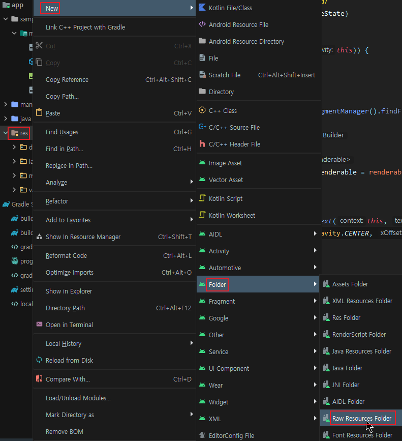이제 raw 폴더를 만들어줘야 한다. res 폴더를 우클릭한 후 아래 그림대로 순서대로 누르면 된다.