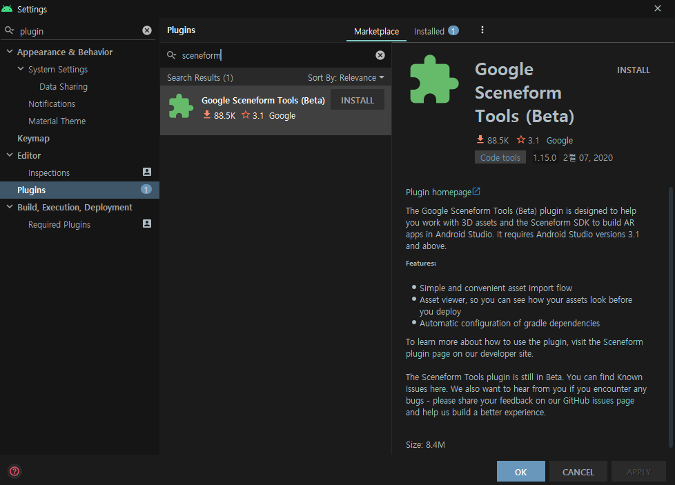 다음은 설정 창을 열어서 plugin을 눌러 플러그인을 설치한다. 검색창에 sceneform이라고 치면 나오는 이것을 설치한다.