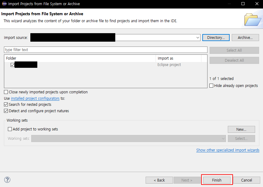 다음으로 import할 폴더를 선택하려면 왼쪽 폴더 트리 밑의 공백에 마우스를 대고 우클릭 > Import를 눌러주면 다시 Projects from Folder or Archive 탭을 선택할 수 있다. 이걸 눌러서 위에서 했던 과정을 반복하면 된다.