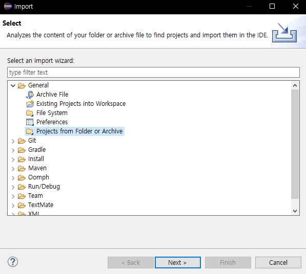 General > Projects from Folder or Archive를 순서대로 누른 후 Next를 누른다.