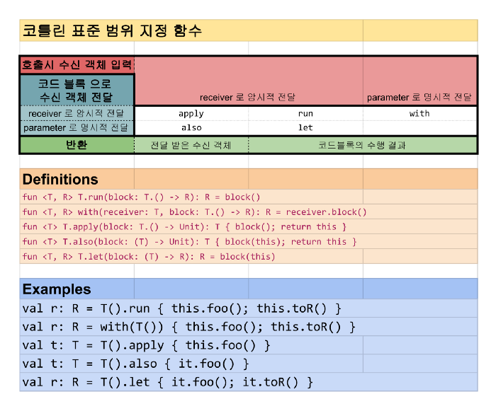 아래는 "코틀린 범위 함수"를 검색하면 나오는 이미지다. 한 방에 범위 함수들의 특징과 원형에 대해서 정리해놓아서 자주 보고 눈에 익히면 좋을 것 같다.