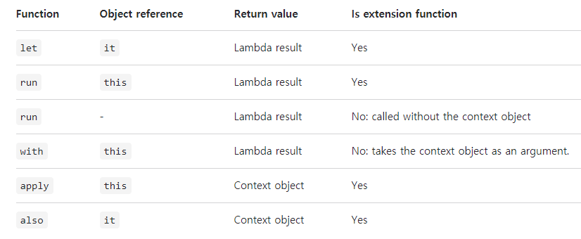 아래는 참고용으로 코틀린 공식 홈페이지에서 가져온 범위 지정 함수 별 설명이다. 너무 간결하긴 하다.