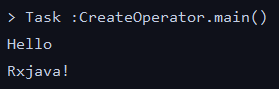 emitter라는 걸 통해 hello와 Rxjava! 라는 문자열을 발행하는 걸 볼 수 있다. 그리고 이 source란 이름의 Observable을 구독하기 위해 subscribe()를 호출하고 그 안에 출력 메서드를 넣어 결과를 출력시킨다.