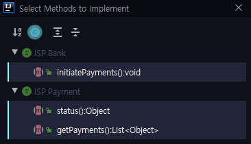 하지만 그 메서드는 BankPayment 클래스에 있을 이유가 없는 쓸모없는 메서드다. 그냥 에러만 던질 뿐이다. 이 경우가 인터페이스 분리 원칙이 위반된 경우다.