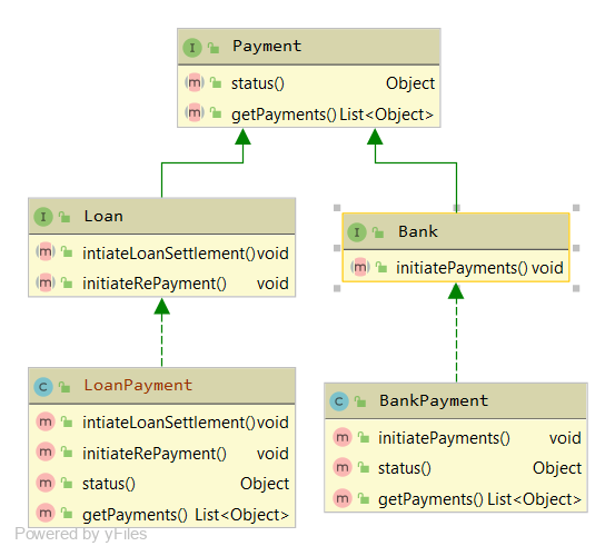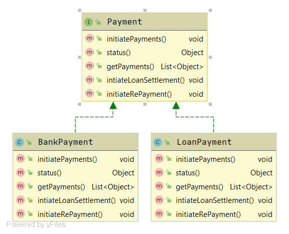 initiatePayments()는 BankPayment 클래스에만 필요하고 initialLoanSettlement()와 initialRePayment()는 LoanPayment 클래스에만 필요한 메서드들이다.