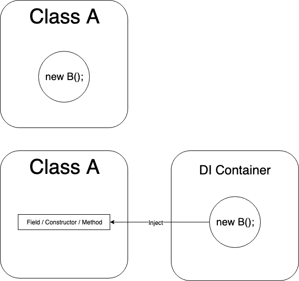 1번째 그림은 A 클래스 안에서 B 클래스의 객체를 만들지만 2번째 그림은 밖에서 의존성 주입 컨테이너에 의해 B 클래스 객체가 만들어져 A 클래스로 주입되는 형태다.