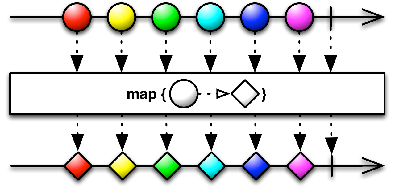 정리하면 Observable이 방출한 아이템 별로 내가 원하는 함수를 적용할 수 있게 해주는 연산자란 뜻 같다. 리턴값은 함수가 적용된 결과의 시퀀스다.