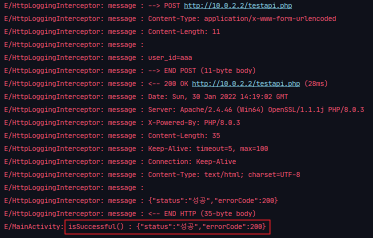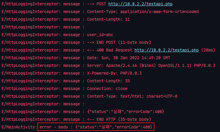 isSuccessful()이 호출되고 서버에서 받은 응답을 보여주고 있다. 여기서 실패 케이스인 abc를 입력 후 api를 호출하면 로그 내용이 조금 바뀐다.