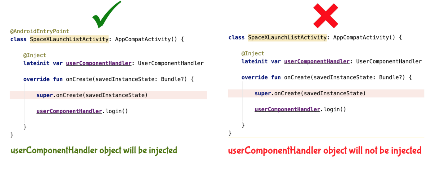 @AndroidEntryPoint에 대해선 아래 이미지를 참고하자. @AndroidEntryPoint를 사용한 경우와 사용하지 않은 경우를 비교한 이미지다.