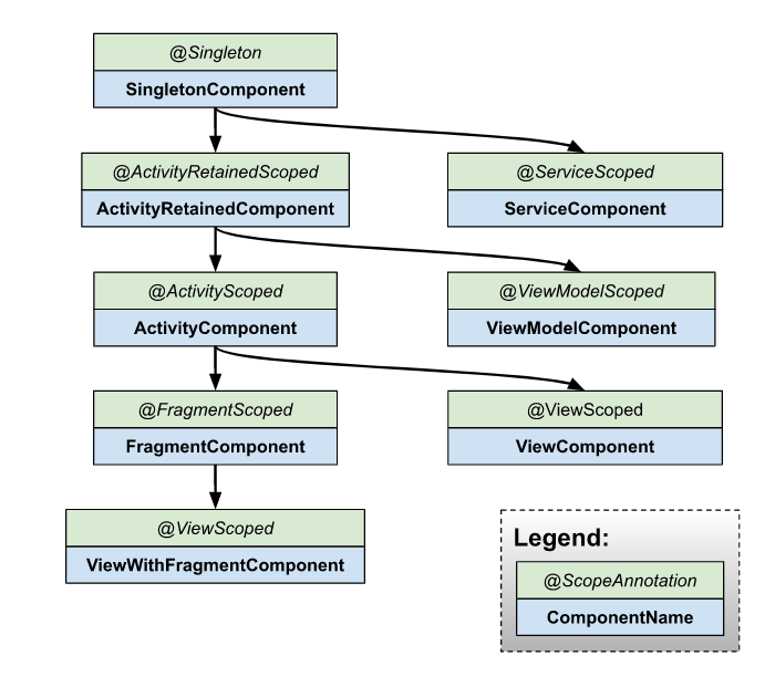 아래는 Hilt 공식 홈페이지에서 제공하는 Hilt 컴포넌트 계층 구조 다이어그램이다.