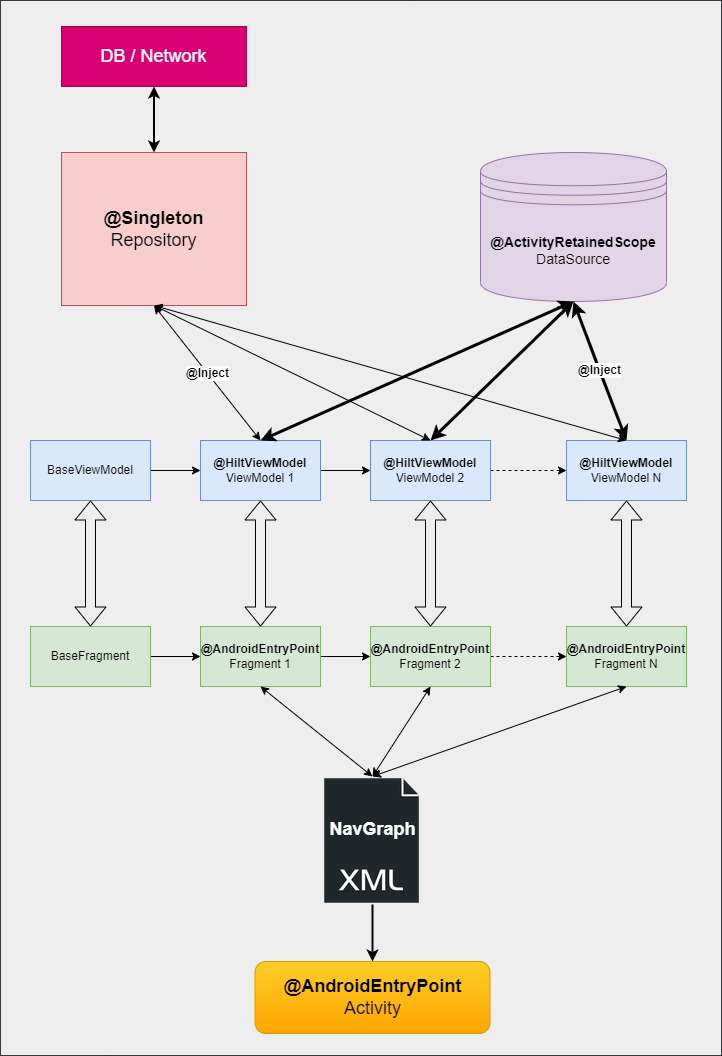 아래 이미지는 Hilt를 사용해서 앱에 DI를 적용했을 때 만들어질 수 있는 앱 아키텍처다.
