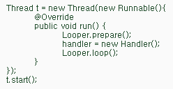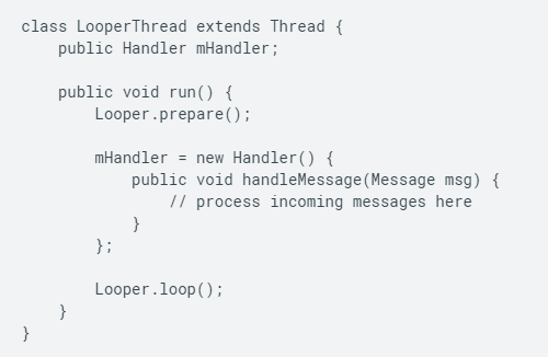 메시지 루프와의 상호작용은 대부분 핸들러 클래스를 통해 이뤄진다. 이것은 루퍼 쓰레드 구현의 전형적인 예시다. prepare()와 loop()을 분리해 루퍼와 통신할 초기 핸들러를 만들어라.