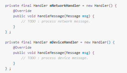이 핸들러라는 건 쓰레드 당 반드시 하나만 생성할 필요는 없다. 오히려 하나의 핸들러에서 모든 메시지를 처리하는 것보다 메시지의 종류, 기능에 따라 여러 핸들러로 나눠 처리하는 게 더 좋다. 물론 메시지를 보내는 쓰레드에서 적절한 핸들러를 선택해 메시지를 보내는 건 잊지 말아야 한다.
