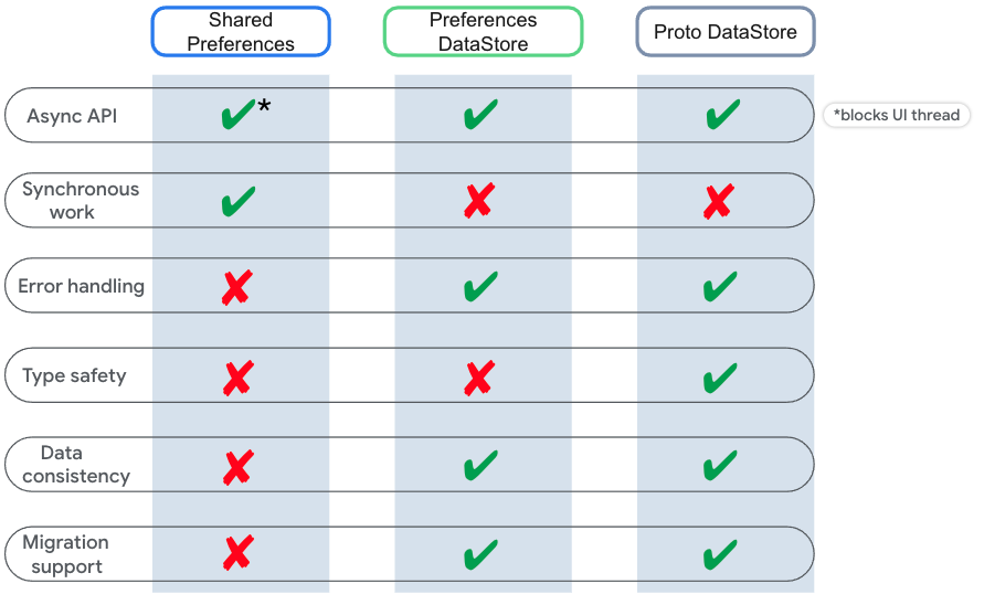 앱에서 쉐어드를 쓰면서 재현하기 어려운 쉐어드 관련 문제를 경험했을 수 있다. 포착되지 않은 예외(uncaught exceptions)로 인해 분석에서 이상한 충돌이 발생하거나 호출할 때 UI 쓰레드를 차단하거나 앱 전체에서 일관되지 않고 지속되는 데이터가 발생한다. DataStore는 이런 모든 문제를 해결하기 위해 구축됐다. 아래는 쉐어드와 DataStore 간의 직접적인 비교다