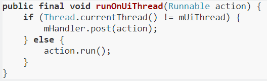 이 메서드는 액티비티 클래스에서 제공되는 메서드다. 개발자가 만든 Runnable 객체를 메인 쓰레드에서 실행되게 하는 메서드인데, 현재 메서드가 메인 쓰레드인지 여부를 검사해 메인 쓰레드가 아니라면 post()를 실행하고, 맞다면 Runnable의 run()을 실행한다.