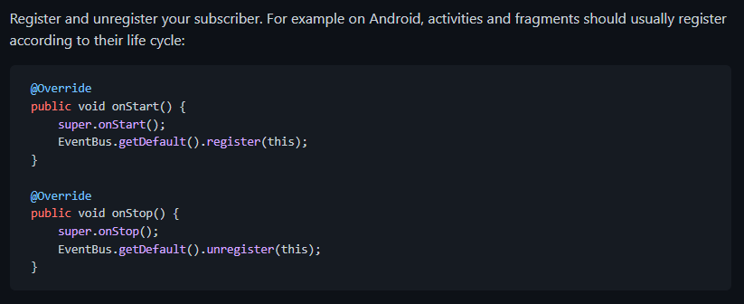 그림만 놓고 보면 이벤트를 보내는 주체(publisher)가 post()에 어떤 이벤트를 넣어서 보낸다고 EventBus에 알리면, EventBus를 구독하고 있는 대상(subscriber)에게 onEvent() 콜백을 통해 이벤트를 전송해주는 듯하다.